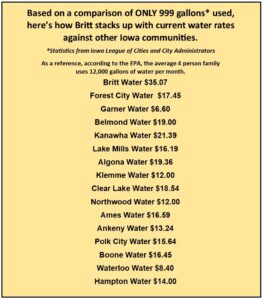According to tonight’s agenda, the council will vote on the 2nd reading to amend section 6-5-8 of the current water ordinance, which does not have an assigned ordinance number, and whether to wave the 3rd reading to amend section 6-5-9 of that same unnumbered ordinance. The municipal code of ordinances on the city of Britt’s website shows ordinance # 505 which only lists the large rate increases that took place in 2021 and 2022, taking Britt to one of the highest water rates in the state and the country. According to the U.S. Energy Information Administration, the average water bill in the U.S. for a family of 4 is $73 per month. According to the Iowa League of Cities, the median in Iowa for 5,000 gallons of water used (which is about 1.5 people) is only $42.50 as compared to Britt’s current rate of $85.16.