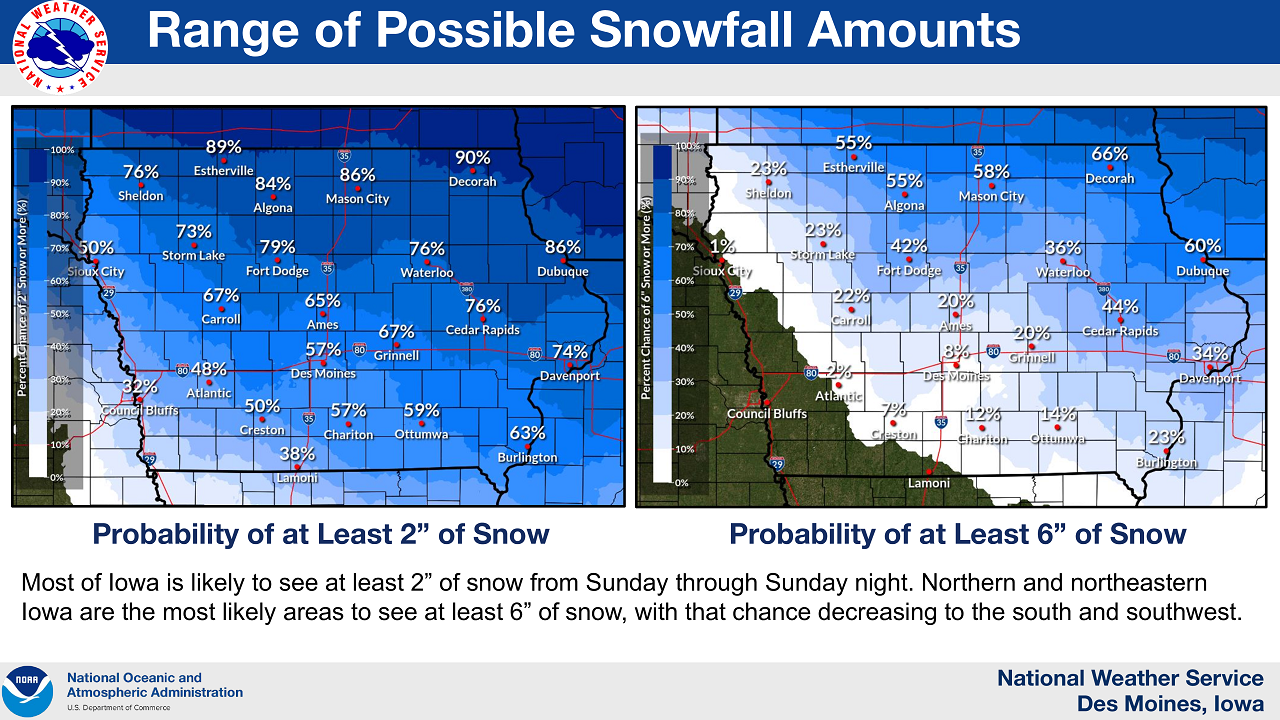 Meteorologists note that most of Iowa is likely to see at least a couple inches of snow, while northern and northeastern parts of the state have the highest chance of seeing six inches or more by Sunday night.