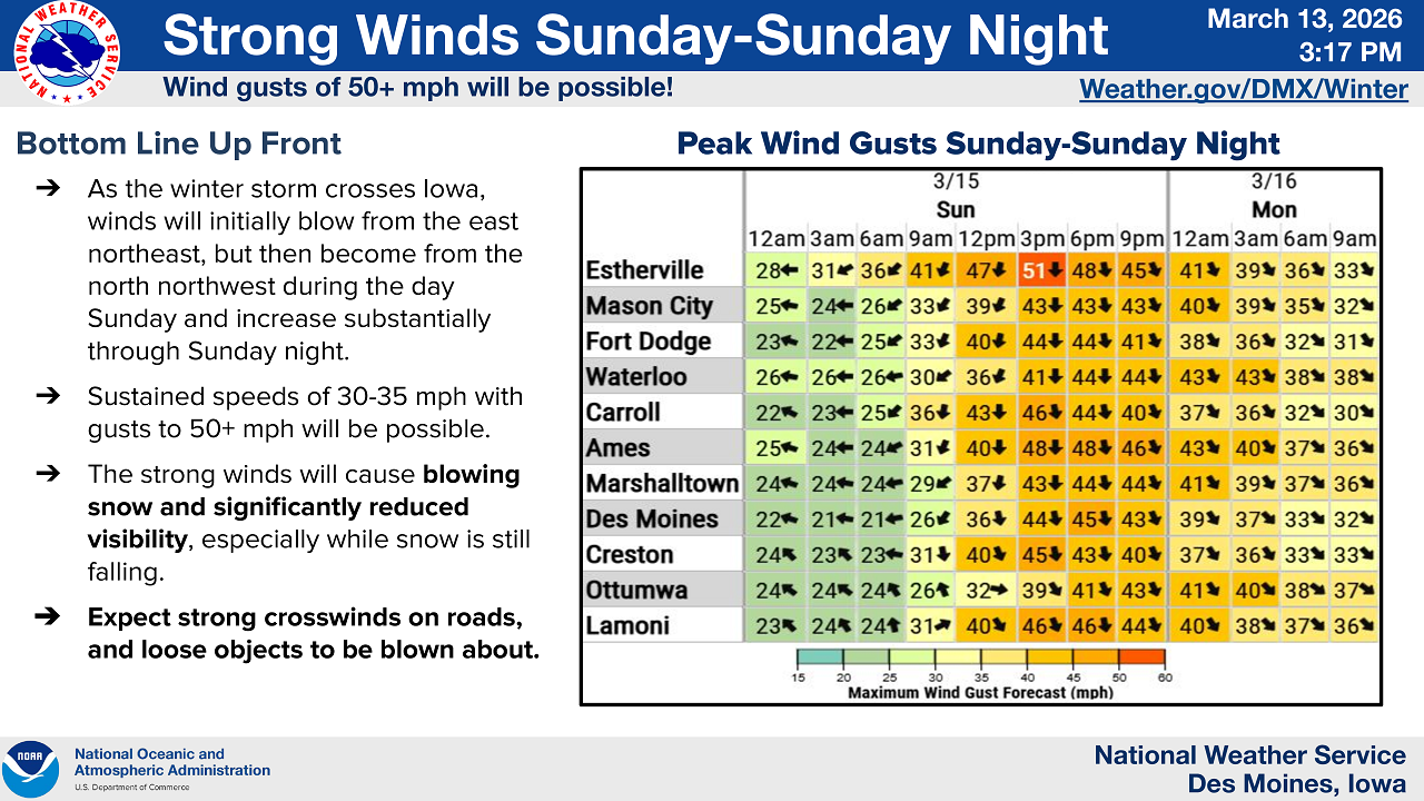 Strong winds are expected to develop Sunday and continue into Sunday night, with sustained winds of 30 to 35 mph and gusts potentially exceeding 50 mph, which could produce widespread blowing snow and sharply reduced visibility.